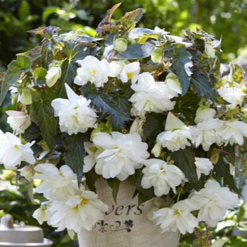Reichblühende Begonie mit schön geformten, gleichmäßigen, weißen Blüten. Durch ihren hängenden Wuchs eignet sich diese Begonie ideal für Blumenampeln oder hohe Töpfe.