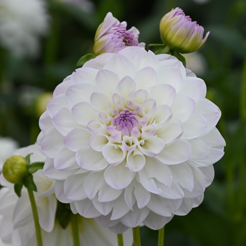 Weiß, lila überhaucht, Höhe 120 cm, Blüten 12-13 cm.