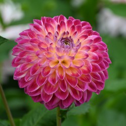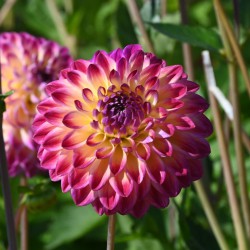 Baldahlia mit kräftigen violett-rosa Blüten an robusten, hohen Stielen. Vom Zentrum der Blüte aus sind die Blütenblätter gelb gefärbt. Blütengröße 10 cm. Sehr gut als Schnittblume geeignet.