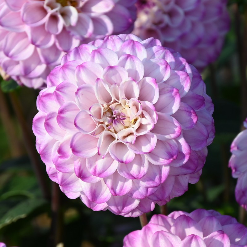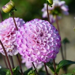 Baldahlia, zartlila-rosa mit einem violetten Akzent an den Blütenblattspitzen. Blütengröße 8 cm.