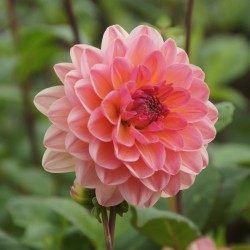 Dekorative Dahlie, Typ Seerose mit warmrosa Blüten, die im Herzen goldgelb sind. Blütengröße: 10 cm. AUS BIOLOGISCHEM ANBAU.