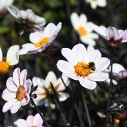 Einfache Dahlia, weiß mit einem variabel rosa Schimmer. Dunkelblättrig. Blüten 10 cm.