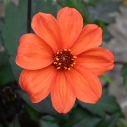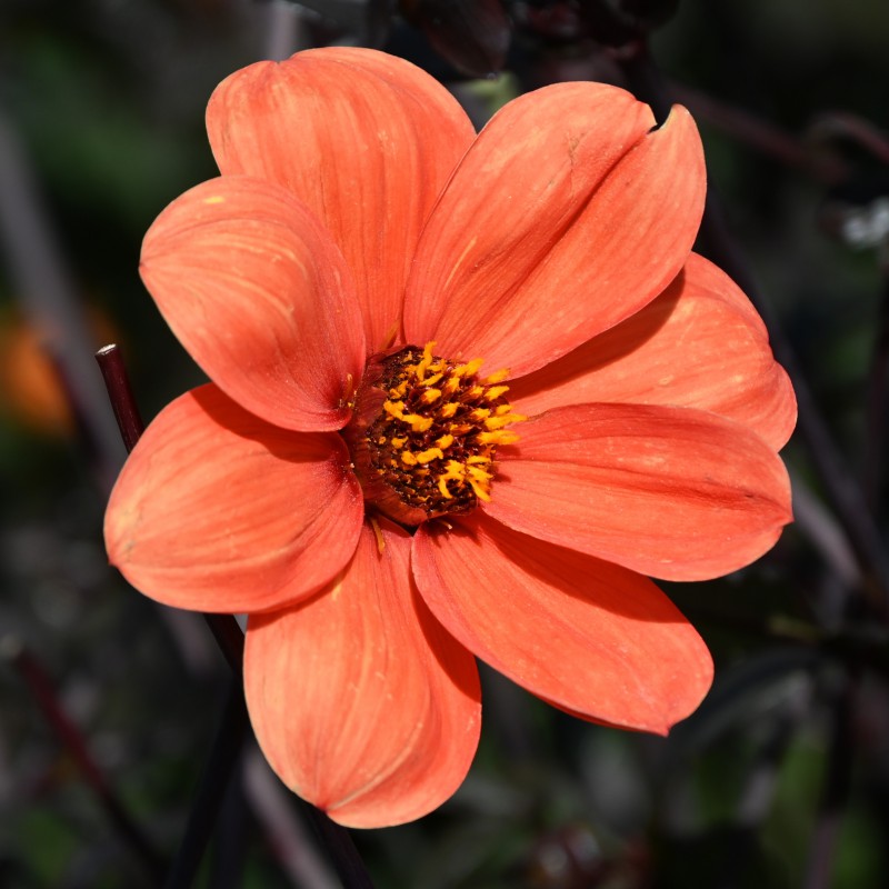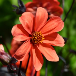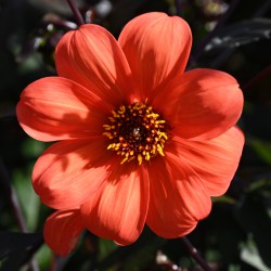 Dunkelblättrige Dahlie mit halbgefüllten, orangefarbenen Blüten, bei denen die Staubgefäße sichtbar sind. Perfekt für Bienen. Blütengröße 9-10 cm.