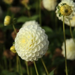 Pompondahlia mit reinweißen, kleinen, runden Blüten. Kräftige Blütenstiele. Blütengröße 6 cm.