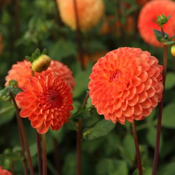 Pompon-Dahlie, schön geformte, runde, orangefarbene Blüten. Blütengröße 6 cm.