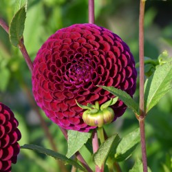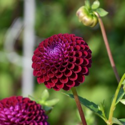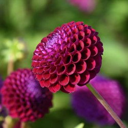 Pompondahlia mit kleinen, violetten, kugelförmigen Blüten. Blütengröße: 7 cm.
