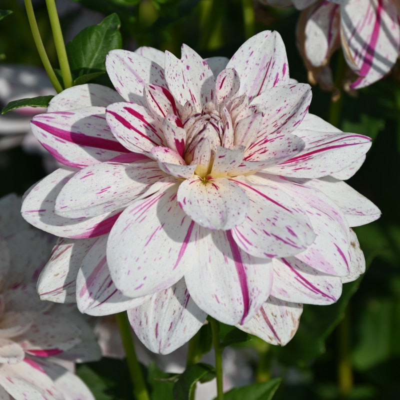 Decorativ. Weiße Blume mit unregelmäßigen breiten und schmalen roten Streifen. Blütengröße 14 cm.