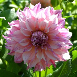 Die hellrosa Version von Dahlia 'Café au Lait' mit leuchtend rosa Streifen. Großblütigen dekorativen Dahlia. Höhe ca. 80 cm, Blüten 25 cm.