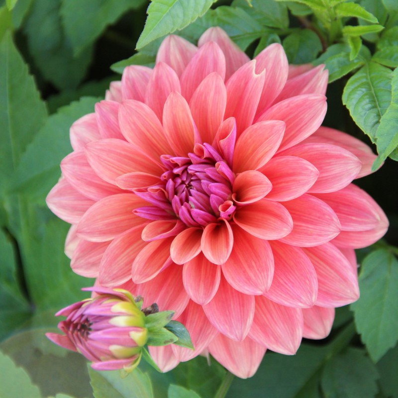 Dekorative Dahlie, korallenrosa Blüten mit violetter Mitte, Blütengröße 15 cm.