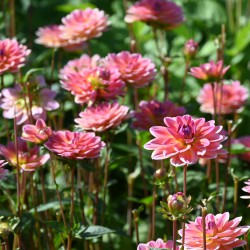 Sehr reich blühende, kleinblütige Dahlie. Halbgefüllte, lachsfarbene Blüten mit gelber Mitte. Blütengröße 8 cm.