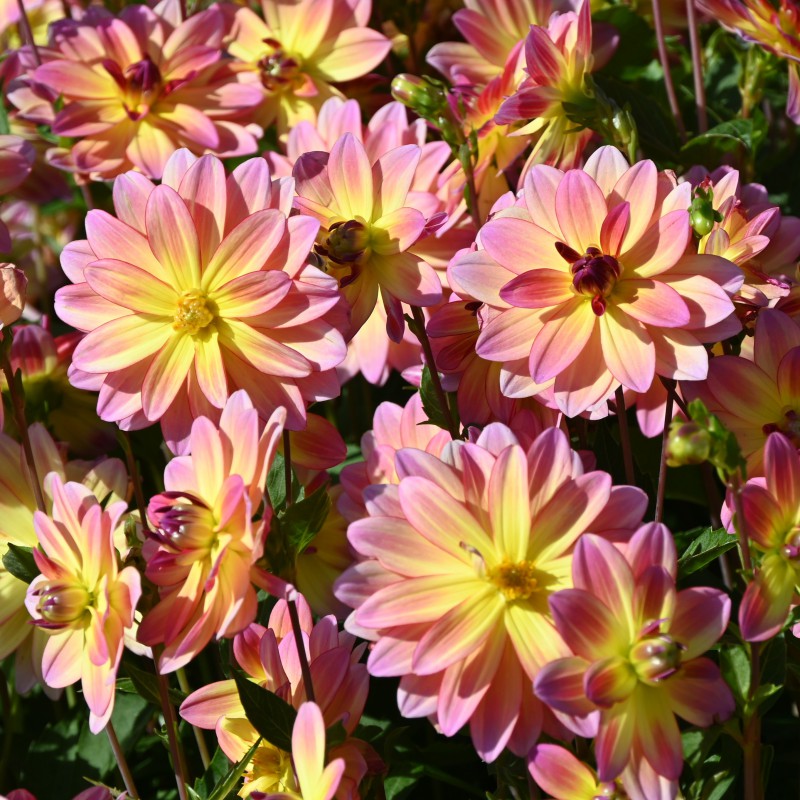 Sehr reich blühende, kleinblütige Dahlie. Halbgefüllte, gelbe Blüten, die an der Spitze der Blütenblätter rosa werden. Blütengröße 8 cm.