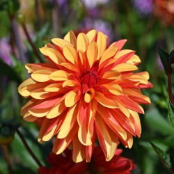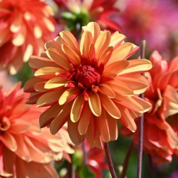 Dekorative Dahlie mit orangefarbenen Blüten, deren Rückseite der Blütenblätter dunkelorange ist. Blütengröße: 11 cm. AUS BIOLOGISCHEM ANBAU.