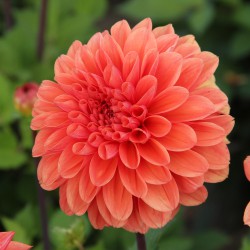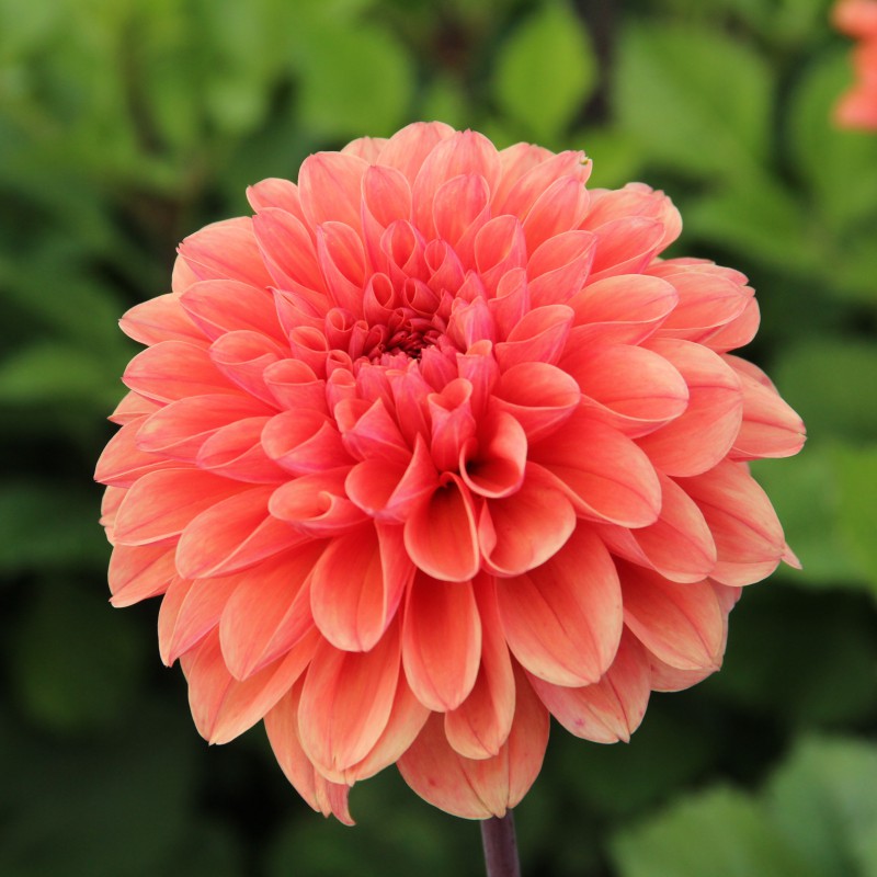 Dekorative Dahlie mit warn orangen Blüten. Blütengröße: 13 cm. AUS BIOLOGISCHEM ANBAU.