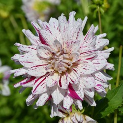 Dekorative Dahlie, große weiße Blüten mit unregelmäßigen purpurroten Sprenkeln und Streifen. Blütengröße 16 cm.