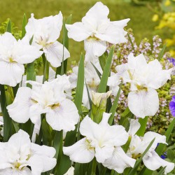 Sibirische Schwertlilie, mehrjährig. Leicht wachsende Iris für trockene und feuchte Böden. Silberweiße Blüten mit zarten lavendelfarbenen Adern.