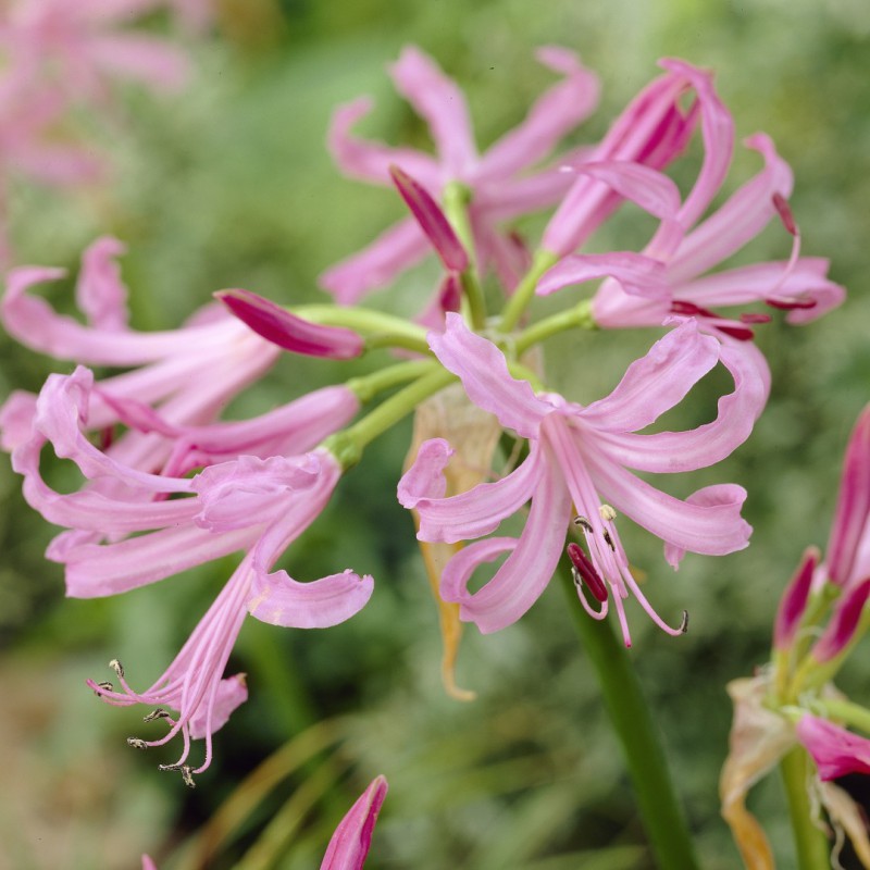 Guernseylilien, herbstblühende Zwiebelpflanze aus Südafrika. Für einen Standort in voller Sonne. Die Nerine ist einigermaßen winterhart und wird an einem geschützten, warmen Ort (eventuell mit Winterschutz) jahrelang wiederkehren und im Herbst ihre Blüten zeigen. Ausgezeichnete Schnittblumen.