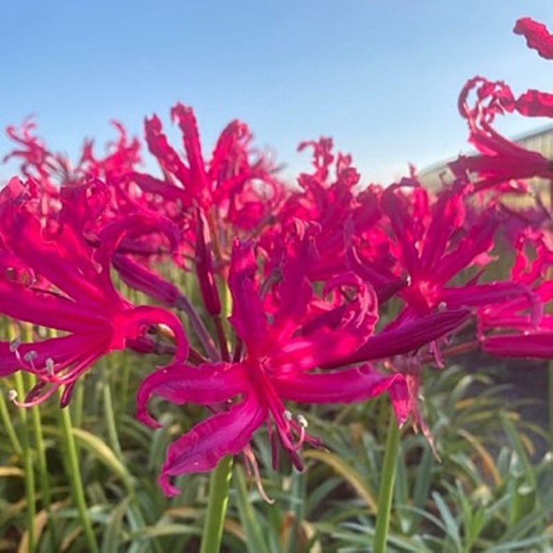 Guernseylilien, herbstblühende Zwiebelpflanze aus Südafrika. Für einen Standort in voller Sonne. Die Nerine ist einigermaßen winterhart und wird an einem geschützten, warmen Ort (eventuell mit Winterschutz) jahrelang wiederkehren und im Herbst ihre Blüten zeigen. Ausgezeichnete Schnittblumen. Kürzlich eingeführt, große kirschrote Blüten an kräftigen Blütenstielen.