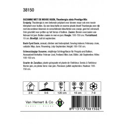 Schwarzäugige Susanne, einjährige Schlingpflanze für Pergola und Balkon. Aussaatzeit Vorkultur: Februar-Juni, Freiland: Mai-Juni. Blüte: Juli-September. Höhe: 100-150 cm.