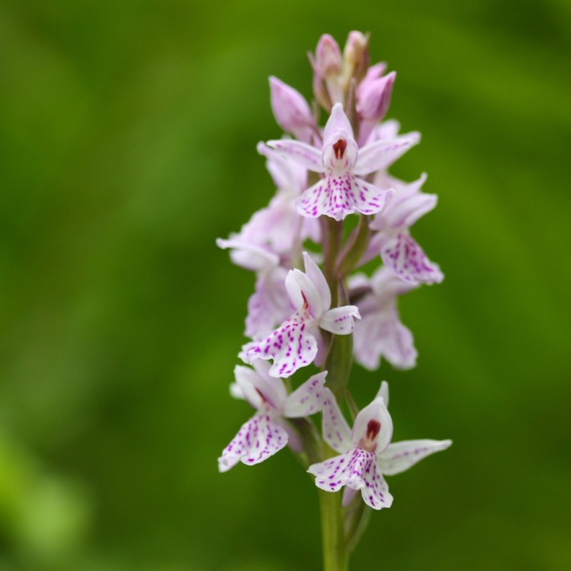 Geflecktes Knabenkraut ist eine europäische Erdorchidee mit hellvioletten bis weißen Blüten in einer ährenförmigen Traube. Diese seltene, einheimische Orchidee wächst meist an sonnigen oder leicht schattigen Standorten in feuchten, nährstoffarmen, leicht sauren, humosen Böden. Sie erhalten eine Pflanze, die in einem 9-cm-Topf (Slow Grow) gezüchtet wurde. CITES, deshalb nicht für die Schweiz.