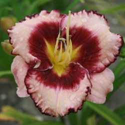 Eine Taglilie aus der Skye-Serie. Rosa Blüten mit dunkelrotem Rand und dunkelrotem Zentrum, 12 cm. Reich blühende und kräftige Rabattenpflanze mit büschelbildender Wuchsform.