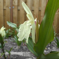 Ingwerorchidee, blüht ab Juni bis August und manchmal im Herbst wieder. Nicht ganz winterhart. Standort: Sonne oder Halbschatten. Klimazone 6-9. Rahmweiß, violett gestreift.